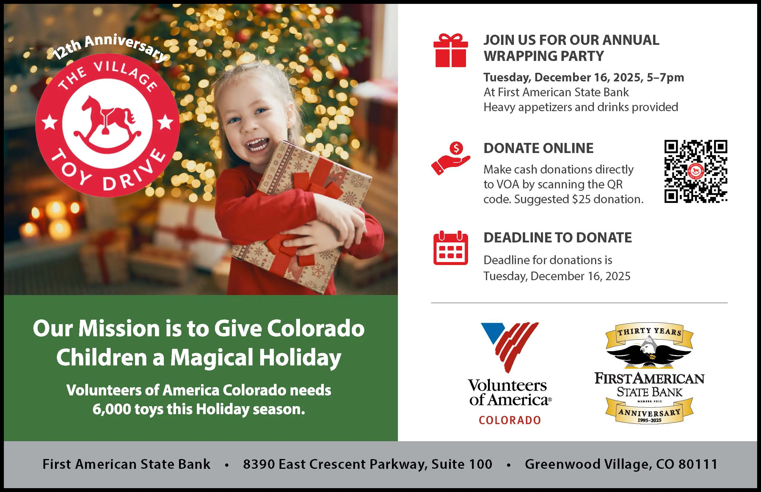First American State Bank is organizing and accepting toys during The Village Toy Drive, benefiting Volunteers of America – Colorado. New and unwrapped toys for children from infant to 18 can be dropped off at the bank located at 8390 E. Crescent Parkway in Greenwood...